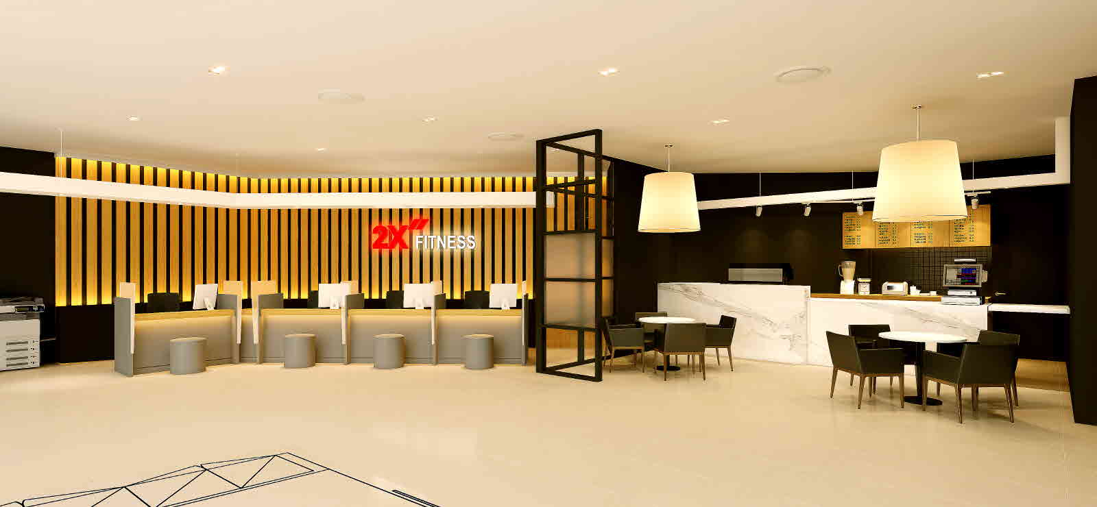 안녕하세요 ~일원점 소식입니다 ^^내부 투시도가 나왔습니다 ~ 사진에서 고급스러운 느낌이 뿜뿜하는데요 ~~ 너~어~무 기대됩니다 !!! 자~ 그럼 투시도를 공개합니다 !! [FC 데스크 및 2X Cafe]저는 고급웨딩홀느낌이 들었는데 어떠신가요? 깔끔한 인테리어가 너무 좋은것 같아요~[머신존]기구들이 모여있는곳입니다 ~통로...